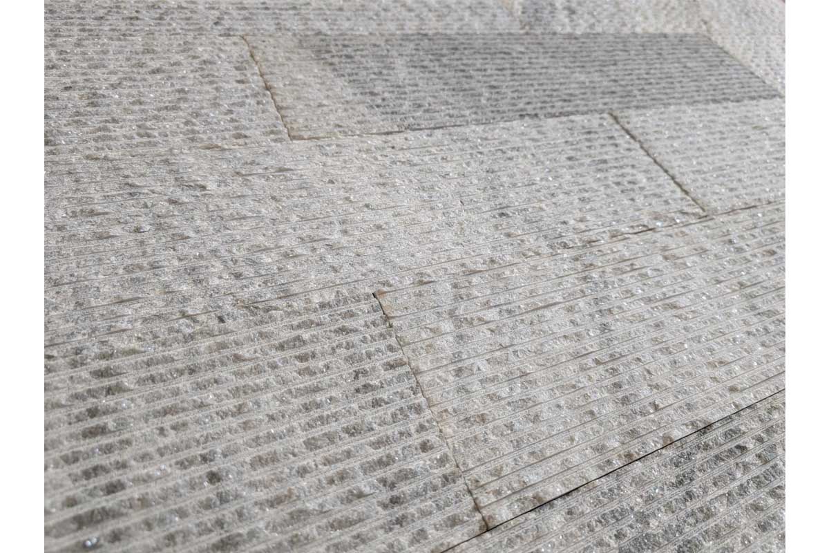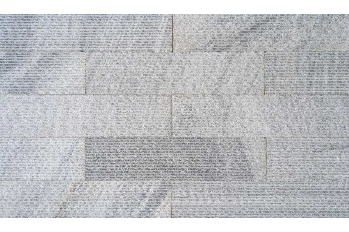 Pearl Grey Granite Cladding features a refined, hand-chiselled texture with narrow, parallel lines that enhance the elongated plank format. The contrasting tonal variations of the grey stone create a sophisticated, contemporary finish, while the linear surface detailing adds depth and visual interest to exterior and interior walls alike.