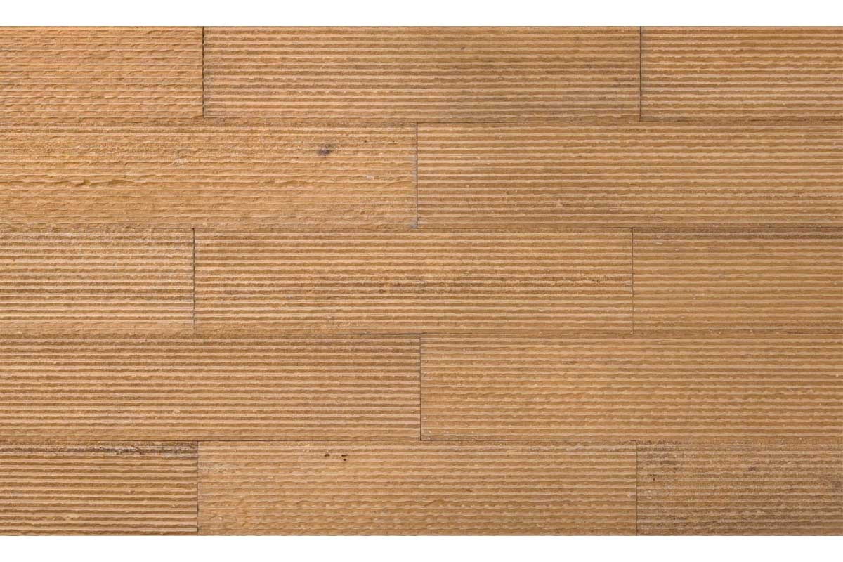 Tuscan Gold Sandstone Cladding offers a striking textured appearance, thanks to its hand-chiselled lines. These emphasise the linear format of the plank-shaped cladding and add a dark/light contrast which adds interest to surfaces. The Tuscan Gold colour will bring a warm, sunbaked ambiance to your outdoor space.